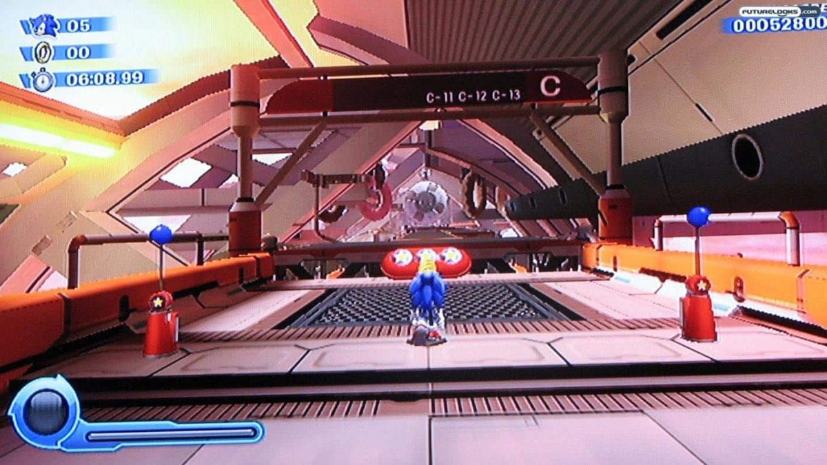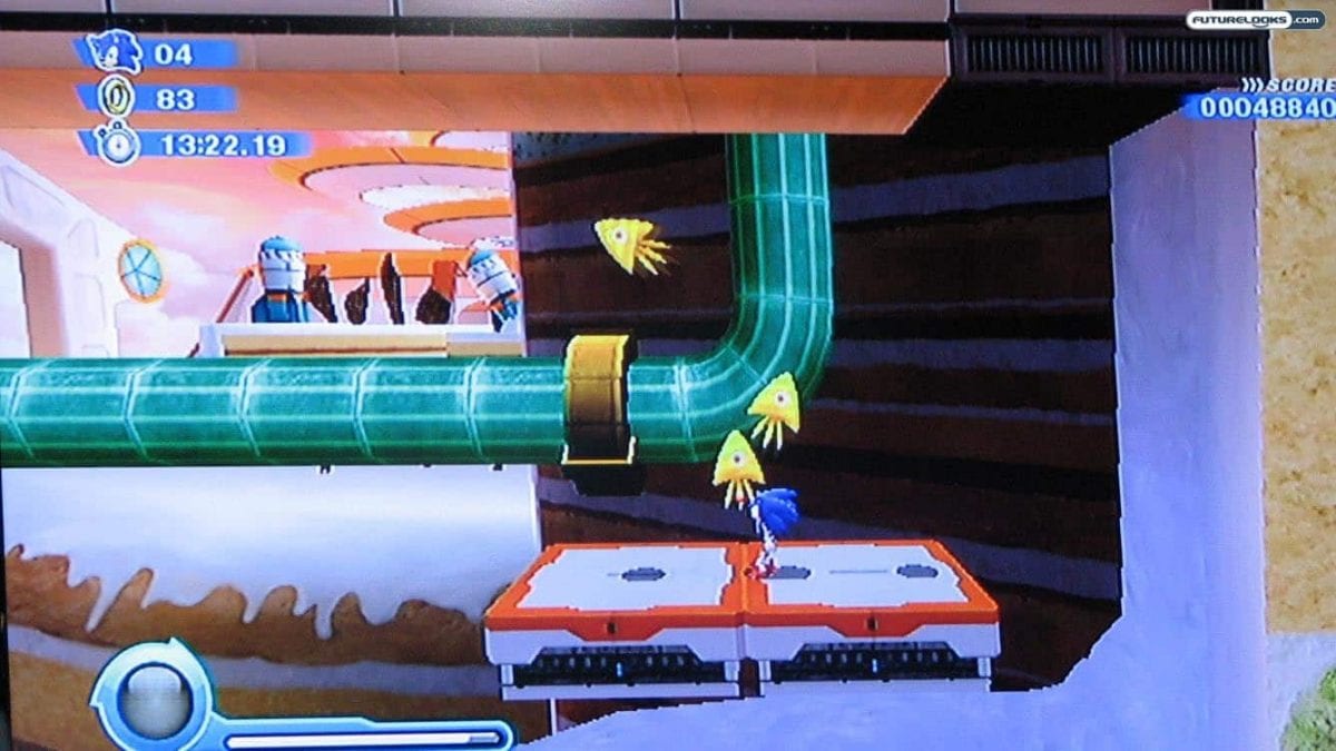 On the Nintendo Wii, most of the action is from an “over the shoulder” point of view, but you still get the same sense of speed as Sonic blast processes his way through the stages.