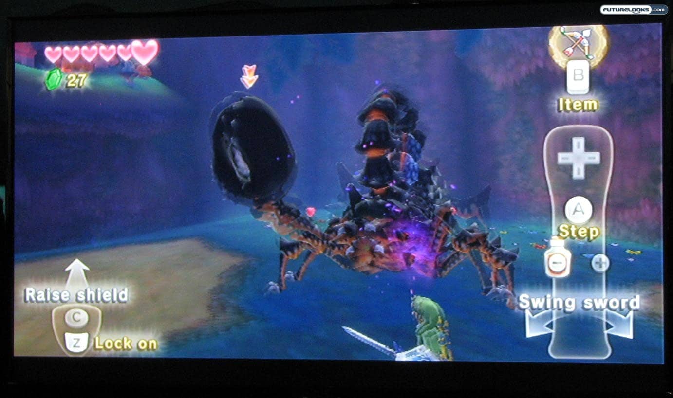 One of the new gameplay mechanics is to hold your sword outward at your side to charge up for a large attack. Take a swipe with the Wii Remote and unleash your fury on your enemies. The Wii MotionPlus also allows for “impressive fencing and shield-blocking activities.”
