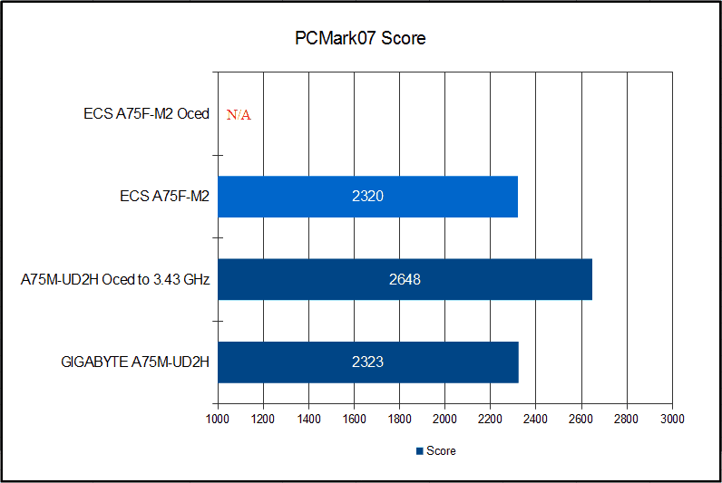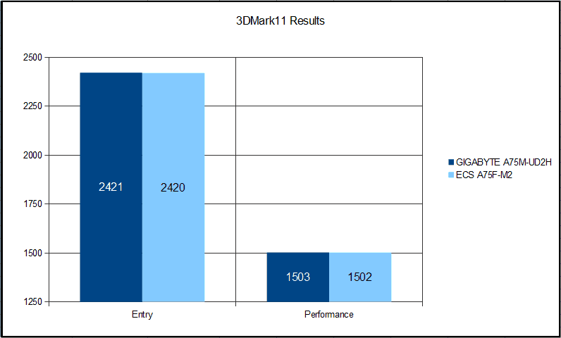 Overclocking was a different story. As I stated before, the ECS A75F-M2 offers no overclocking options. While a simple bus speed change provides a 335 point boost for the UD2H, the M2 simply can’t do the same.