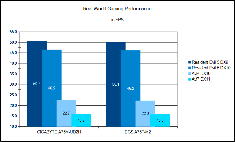 The ECS A75F-M2 performs exactly the same at stock settings. Unlike high-end motherboards, there just isn’t enough difference in the APU motherboard designs to alter performance.