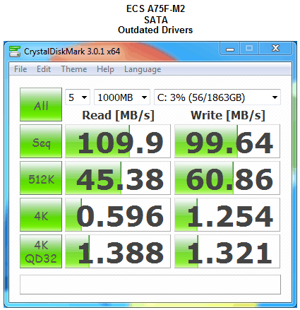 The ECS board does not perform well in the sequential SATA test; however, this is not the fault of the motherboard. The 1.2.1.296 AMD AHCI drivers being provided by ECS on their site are dated 3/14/11. The 1.2.1.269 AMD AHCI drivers on GIGABYTE’s site are dated 6/1/11. Once I installed the drivers from GIGABYTE on the ECS board, its performance in sequential reads and writes matched that of the GIGABYTE A75M. While the motherboard ultimately proved to have the same performance, I have to hold ECS accountable for providing outdated drivers to their customers.