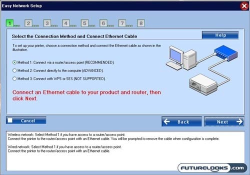 After this, it was off to the computer to handle that part of the process. I set it up so that the printer is connected to my wireless router via the provided Ethernet cable, but getting the printer to be connected to my network via Wi-Fi is very similar.