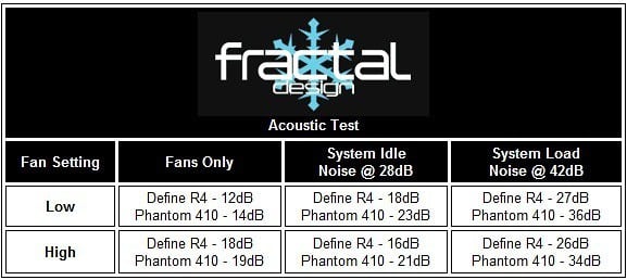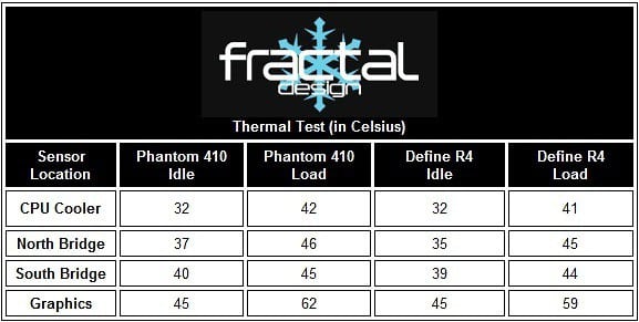 The performance table basically solidifies my preliminary performance estimations. The Phantom 410 is a pretty darn good enclosure when it comes to keeping things cool. But the Define R4 on the average ran a bit cooler and quite a bit quieter. The final proof of optimal air flow is that the system temps were pretty consistent with the side panel on or off.