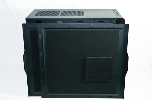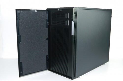 There is a discreet vented door within the front bezel that is hinged at the bottom. Press the two top corner tabs to release the spring loaded locks which allows the door to swing down. Behind it is also a hinged, removable filter that slides right out for easy cleaning. Further behind that is a tooless dual fan bay with space for stacking up to two 140mm cooling fans. The ease of access and maintenance of the fans and filters is simply fantastic.