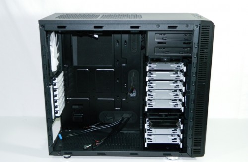 The door smoothly swings open to reveal a familiar vented design seen on many a pro server type enclosures. There’s only two sturdy 5.25″ bay covers that release or lock back in to place with a single thumb lock. The top slot is prepped for one unit. To the right of the bays is a 3-speed fan control that supports three fans. However, we’ve had good luck using splitters for four. Fractal leaves it up to you to connect the fans.