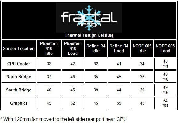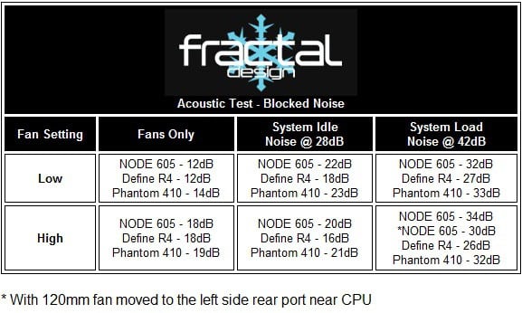As you can see, the NODE 605 helps manage temps decently given the extreme heat this system generates. However, the cool air isn’t directly hitting the system in the default configuration. Moving the right side 120mm fan to the side rear port improves cooling. Adding 80mm fans to the back or moving the left side 120mm fan back had no measurable affect on temps. But moving the fans did impact system noise. Let’s check that out next.