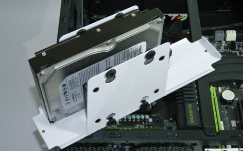 Finally, you have about 7.375 inches to the first white tray and 10 inches to the second white tray. The NVIDIA 8800 GTX Ultra (10.5 inches) wouldn’t fit unless all the trays are removed. The bottom line is you don’t want to utilize video cards longer than a GTX 560 Ti. However, there is just enough room that you could install both hard drive hangers and install just an SSD in the one hanging over the video card.
