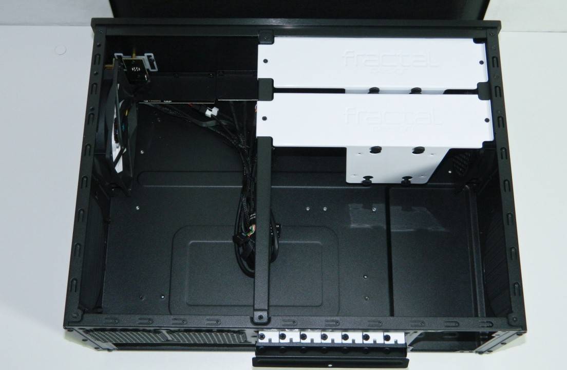 As mentioned earlier, the NODE 605 has as single lid rather than full shell like many other HTPC enclosures. Just a few screws later, it lifts off. Once inside, the birds eye view reveals two white removable “hanging” HDD/SSD trays. There are rubber grommets to limit HDD vibration installed in each one. Four small holes accommodate an SSD on each side. The interior is otherwise pretty simple and uncomplicated for getting set up and seems to provide a good amount of room for cable management.