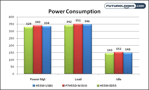 One thing micro-ATX platforms tend to need less of is power especially compared to previous generation platforms with GPUs built into the chipsets. The H55 is specifically aimed at supporting the Core i5 processors with the integrated graphics core which requires even less power. What we’re looking for here is standard integrated performance compared to using a descrete graphics card. Compare this to your standard ATX right now and the results will be clear.
