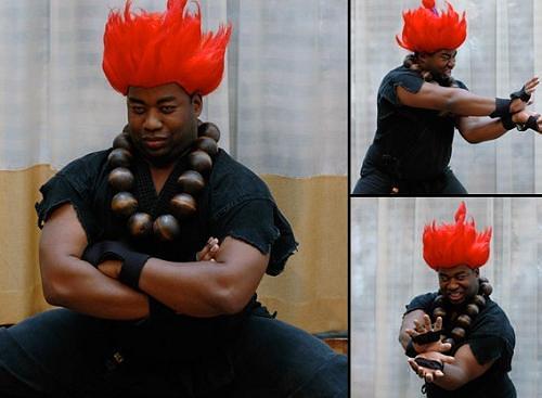 The Akuma/Gouki costume shown above can be found at HalloweenCostumeSale for about fifty bucks and it comes with the gi top and bottom, rope belt, fighting gloves, and a prayer bead necklace. Unfortunately, the flaming red wig is not included.