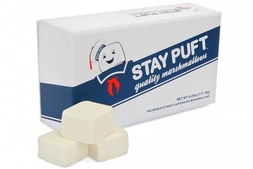 What you see here are Ghostbusters-inspired Stay Puft Marshmallows that have been infused with caffeine. They’re marketed as the world’s first caffeinated marshmallows and they’re made with all-natural ingredients. The box is kinda squishy too.