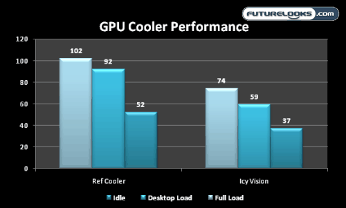 The first thing you can expect from the ICY Vision is a nice drop in temps across the spectrum as it should be with any aftermarket cooler. The card idled at 37C and reached 59C while running Heaven 2.1 demo repeatedly. That beats the reference coolers usual 90C average while just gaming. To take it up a level, and to ensure the card was pushing maximum amounts of data through the GPU, we used the extremely punishing Furmark benchmark.