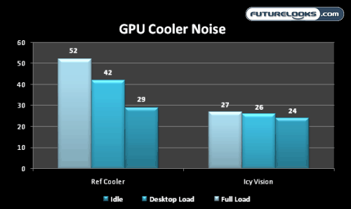 While not sure if it’s the fault of the latest NVidia drivers or the card’s firmware, the Vision never went below 24dBA and just hit 27dBA during Furmark benching. We aren’t complaining though. Whether using a fan controller or plugging straight in to the GTX480 fan port, the Vision is still much quieter across the spectrum than the reference cooler.