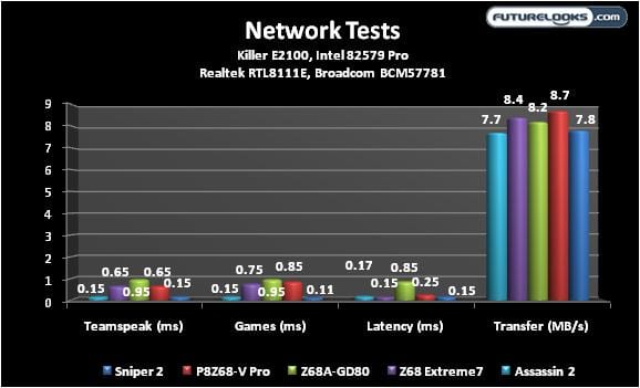 Assassin 2 uses the Killer E2100 embedded network processor as does the X58 Assassin. Intel naturally uses their own Intel LAN Pro while other manufacturers implement Realtek and Broadcom. Here are some transfer rates and latency scores.