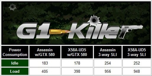 Power consumption reminds us that we’re using an X58 motherboard as they consume more power than any other Intel chipset desktop solution. Our G1 Assassin with a single GTX 580 idled at 183 watts and reached 405 watts running Furmark and Prime95. When running 3-way SLI, the system needed a lot more power, topping out at 956 watts. This is very typical of any fully loaded high end gaming system when running these types of configurations so make sure your power supply is at least 1200 watts in these scenarios.