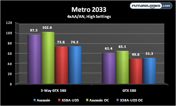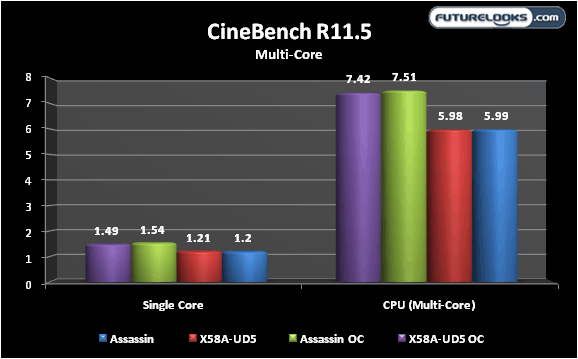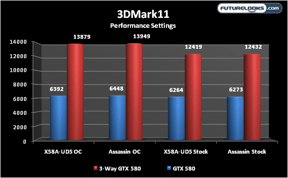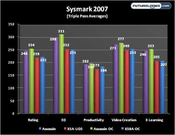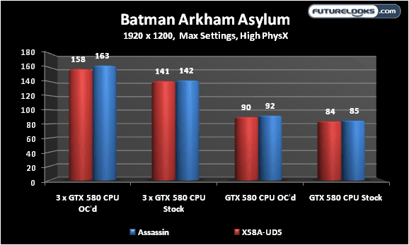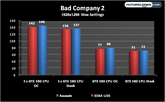 The Assassin outpaced the UD5 when overclocked. The upper end stable clocks were just too much for the UD5. Otherwise, stock frame rates were extremely close.
