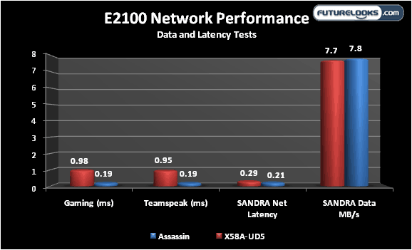 SANDRA revealed that regular network rates and latencies were very similar between the two boards. Both offer about 7.7 to 7.8 MB/s data rates with the Killer at .21 and UD5 at .24ms latencies. Anything you do on the web like torrents, FTPs, and file downloads won’t be any faster for either, which is to be expected.