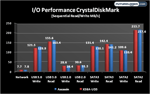 Look at the connectivity options we find that most of the I/O performance is very comparable which is to be expected since the boards use the same SATA2 and SATA3 controllers. But, for some reason, the G1 Assassin seems to give better write performance under USB 3.0. We’ll take what we can get.