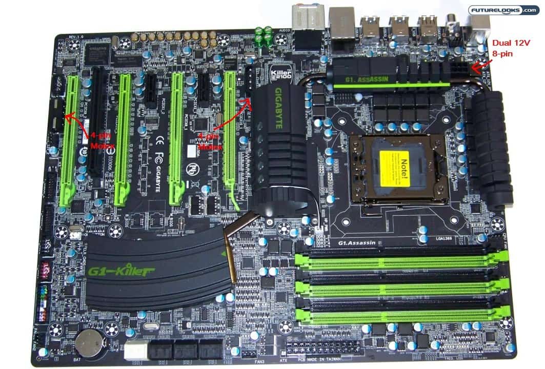 There are also two 4-pin power connectors located above the top and lower PCIE slots. Their purpose is to ensure stability by getting ample power to the multiple graphics cards as some of them have been known to mysteriously need more than the maximum 75 watts power allocation from the board’s PCIE slots. However, it isn’t necessary for mainstream single and 2-way SLI configurations like a pair of GTX 560 Ti video cards.