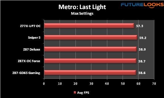 Like its predecessor, Metro: Last Light chews up the bunch pretty harshly. I reran the benchmark six times to get this average. The new drivers help just a bit. Again, the GIGABYTE G1-Killer Sniper 5 was smooth.