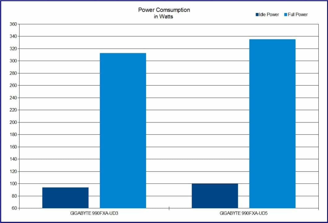 As expected, the GA-990FXA-UD3 uses less power than its bigger brother the GA-990FXA-UD5. At idle I see a difference of about 6 watts with power use being 93.6 and 99.6 watts respectively. At my tested maximum load for the system I saw a difference of 22.6 watts with the power us being 312.6 and 335 respectively.