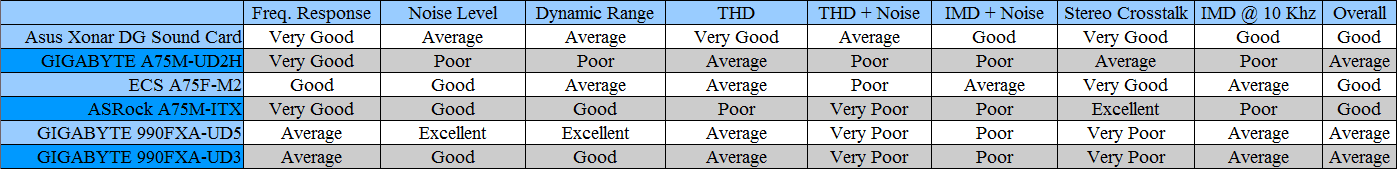 There only difference is in the Dynamic Range and Noise Level in which the 990FXA-UD5 is one tier above our 990FXA-UD3. While this does mean the UD5 should have better audio, real world testing does not reflect this. The same issues I have with the UD5 built-in audio still exist. It produces good sound quality at lower bit rate songs with full body with little distortion or noise; however, there is some slight audio bleed to the front channels during 5.1 playback.