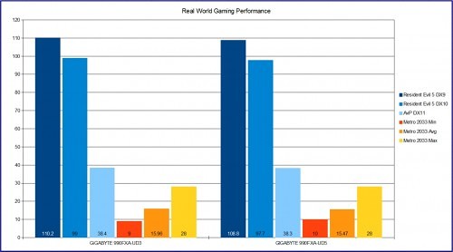 As you can see, the difference in gaming is non-existent. There is a maximum advantage of 1.4 FPS for the GA-990FXA-UD3, but this could be due to the number of factors including the Bulldozer Optimization patches for Windows 7. Either way the difference is less than 2% and cannot be felt in day to day use.