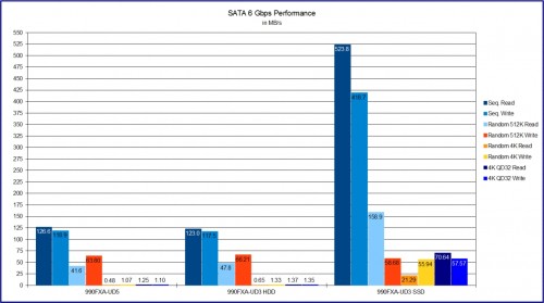 The GA-990FXA-UD3 comes out ahead of the UD5 in every test by a small margin except for sequential read/write testing for mechanical HDDs. Please note the hard drive test for the 990FXA-UD5 were done on the drive being used as the primary system drive, which could have changed the results. It is also very clear why comparing an SSD to a mechanical HDD is not fair as the random 512K write speed aren’t even in the same ballpark. The SSD used is rated to have a 520 MB/s read and 490 MB/s write speed. The GA-990FX-UD3 pushes past the read speed by 3.7 MB/s but falls just over 70 MB/s slower than the best case performance.