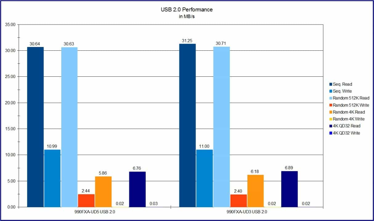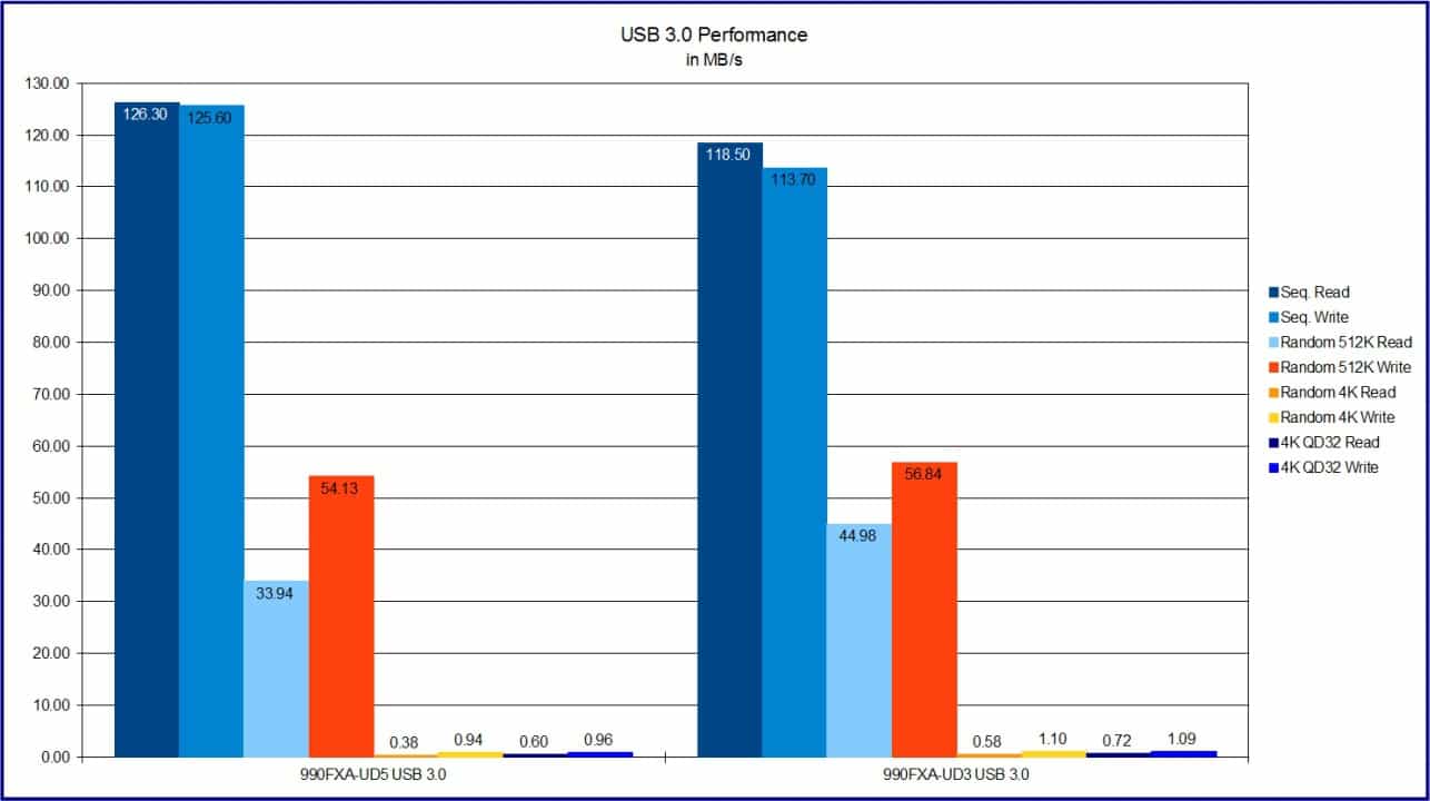 This time we get the same performance as we did in the SATA testing. The GA-990FXA-UD3 has better performance in every test, some by a significant margin, except for the sequential read and sequential write tests. Both motherboards are using the same native SATA controller and the same Etron EJ168 chip for USB 3.0, so I am not sure why the same trend is occurring. There may be some difference in how each is attached to the south bridge.