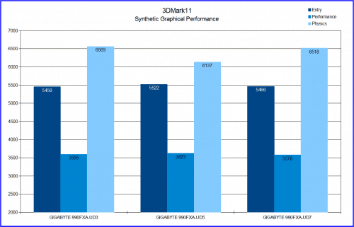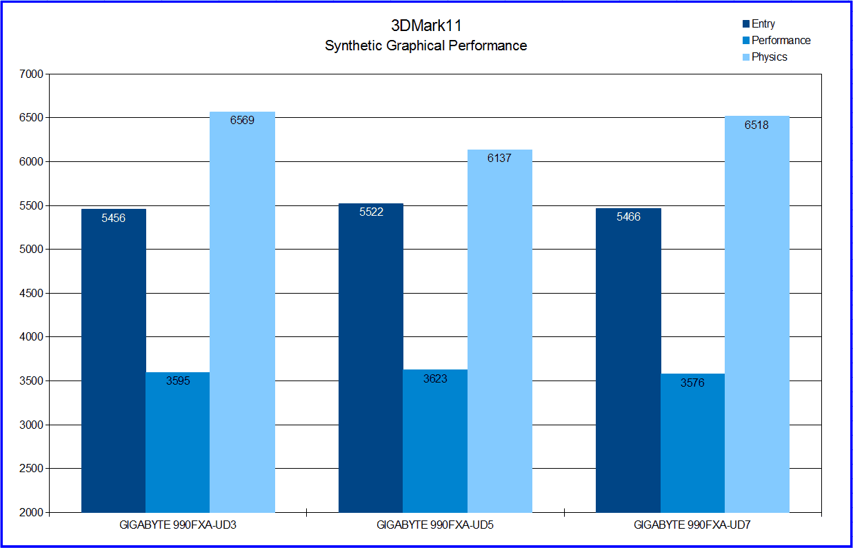 In this test all three of GIGABYTE’s 990FX boards come within less than a 100 points of each other in each test, except for Physics. For some reason the UD5 falls a little behind in this category, but this is because those numbers were done prior to the Windows 7 Bulldozer patches. While these patches reduce performance by a very small percentage, it did improve multi-core performance which affect tests such as Physics.