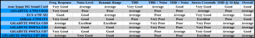 Lets get right to the question at hand. Should you use the Dolby Home Theater or the Realtek codec for your system? The answer is, “it depends”. As you can see in the chart the Realtek ALC889 codecs work better with the Realtek audio chip. The reason for this is the improved freq. response range and improved noise control with the intermodulation distortion. Basically it expands the range of frequencies and improves on control noise when a single line has more than one signal.