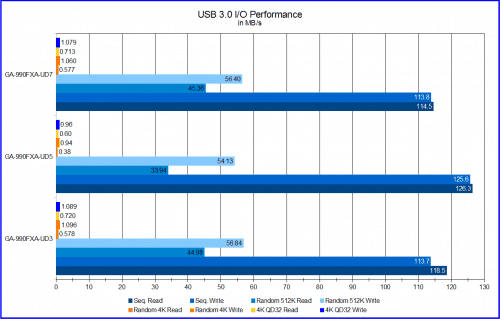 These tests are also a little different as the 990FXA-UD7 is pretty much on par with the other two boards. The only stand out result is the sequential tests which the 990FXA-UD5 takes the lead in by 8 to 12 MB/s overall.