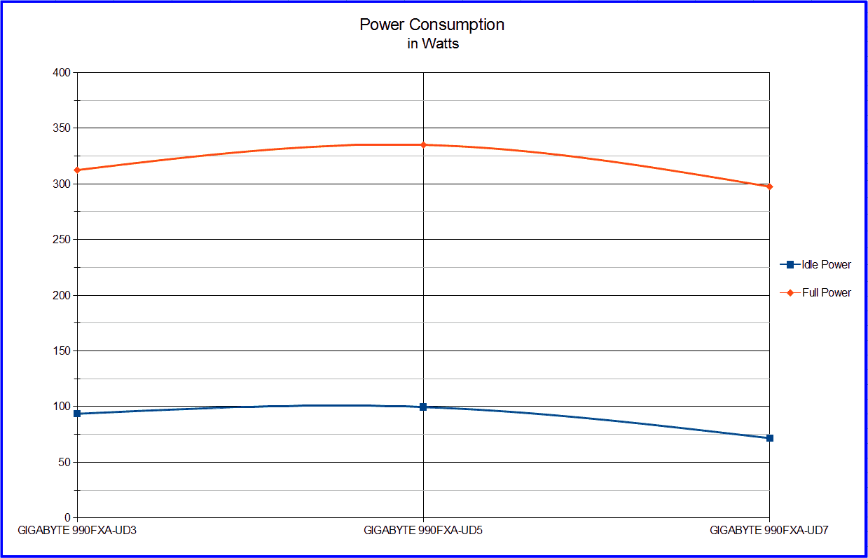 The important thing to notice here is that the GIGABYTE GA-990FXA-UD7 uses less power at idle and full load. At idle the UD7 is a almost 24 watts less power than the UD3. At full load it uses 14 watts less power than the UD3. There is no comparison with the UD5 at all since it uses 25 watts less at full load and nearly 30 at idle. I believe this is due mainly to the addition of the AMD APM addition in the BIOS which is a unique feature of the UD7.