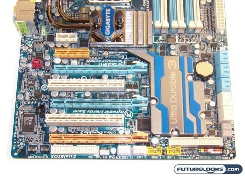 Since this platform supports CrossfireX and nVidia SLI, we have the third orange colored PCI Express slot. The orange slot allows you to install a third video card if you want to run three nVidia based graphics cards in SLI. Naturally, the third card will pick up can pick up phsyics when enabled in the video driver. This seemingly passive platform transforms in to a game chewing, frame generating monster. And that’s partially why you want it, right?