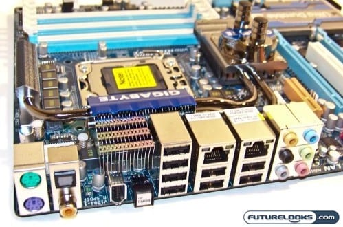 The board is covered with some very aggressive heat pipe cooling. Gun metal gray heat sinks cover all the components that tend to get hot during “extreme operations” such as overclocking. That’s why there are two capped ports on the chipset heat sink which double as a “chipset water block” to help curb extreme temperatures. Fittngs are a standard 3/8 ID (internal dimension) barb so it’ll work with the most common water cooling systems.