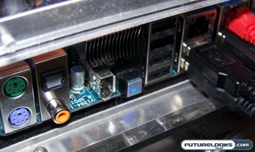 Looking at the back of the motherboard, you can see there are eight USB 2.0 ports available, not including the onboard USB headers. You have physical audio jacks as well as both optical and coaxial 7.1 Channel High Definition audio ports. Since Firewire isn’t a commonly needed feature, engineers opted to include the two extra 1394 ports as onboard headers that work in conjunction with the included Firewire PCI bracket. The physical one is tucked beside the four main USB ports in the middle.