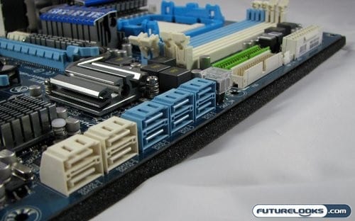 As for the ports along the lower edge, the more I look at them the more I understand what GIGABYTE is trying to implement. Rarely do system builders rely on rear brackets for FireWire and USB support. That is especially true with this board and its 8 rear USB ports and two FireWire ports. With this in mind GIGABYTE moved the USB and FireWire headers further forward to easily reach the cables for front mounted ports. They also did the same with the front panel audio, moving it close to the rear ports. They’ve even placed headers for a serial and parallel port near the bottom of the board, so you can install a bracket for those ports and place it nicely out of the way.