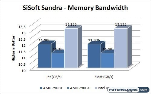 We used the built in database results within Sandra to compare against how our test board performed, choosing available parts that best compare against our test system. The AMD 790FX chipset found on the MA790FXT-UD5P is definitely at the top of the heap within the realm of AMD, besting the very similar AMD 790GX chipset which was the staple of the Spider Platform. However both chipsets fall before the Intel silicon, with the latter posting a 15% performance increase over the former.