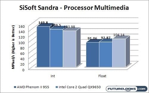Not surprisingly, the Core i7 handily beats everything here in floating point performance, but the Intel Core 2 Quad QX9650 and AMD Phenom II 955 shown here are quite close to each other in terms of performance. However, the AMD part is still quite a bit cheaper.