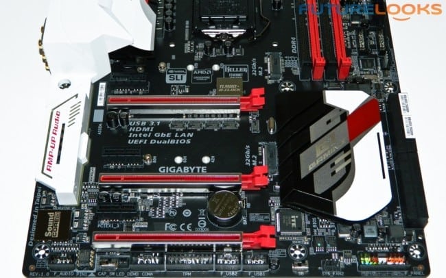The Gigabyte GA-Z7170X-Gaming G1, Gaming GT, and Gaming 7 all sport the red on white heat sinks. However, any other Gaming SKU will sport the red on black heat sink. Additionally, most of the Gaming series includes the OP-AMP except for the GA-Z170N-Gaming 5 mini-ITX and GA-Z170 G.1 Sniper ATX motherboards. It’s understandable why the mini-ITX doesn’t have it. But with a name like the G.1 Sniper, it’s a little confusing.