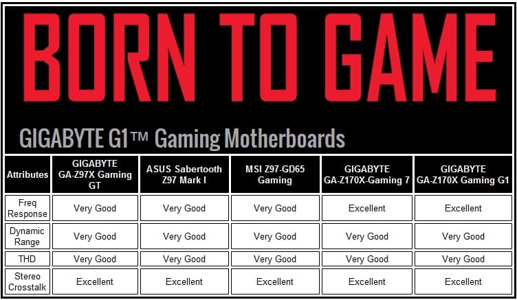 The Intel Z97 platform heralded a new standard in audio quality. Stereo crosstalk is non existent, total harmonic distortion is surprisingly minimal, volumes are higher, and clarity is much better. The GIGABYTE GA-Z170X-Gaming 7 and G1 both take that to the next level.