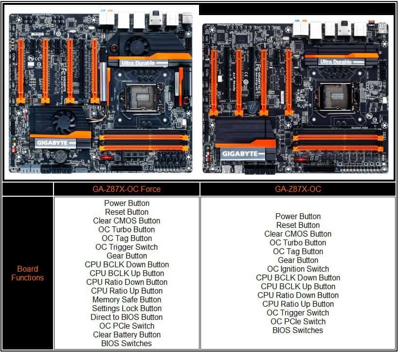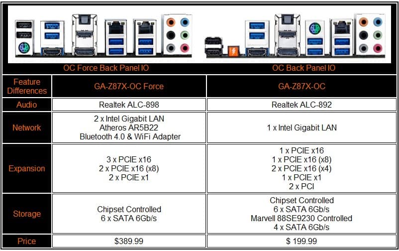 As you can see, different audio processors, network ports, expansion slots, SATA3 controller, and a few IO ports in the back are different. The Force has a bigger PCIE highway which is best for enthusiasts who want to utilize up to three PCIE 3.0 NVIDIA graphics cards to set some world records. However, if you only plan to use one or two, the regular OC will do just fine. A significant $190 US MSRP difference separates the two as the top end GA-Z87X-OC Force retails for $389.99 US MSRP while the regular GA-Z87X-OC retails for $199.99 US MSRP.