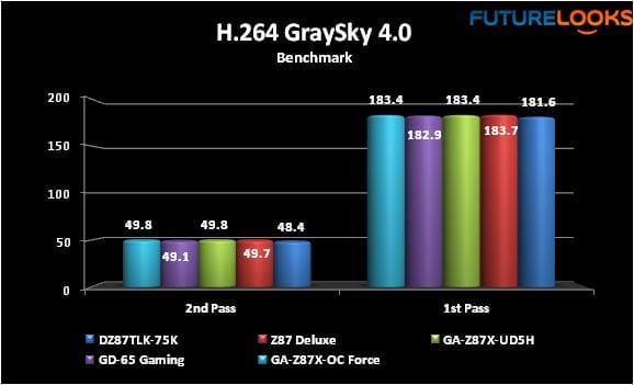 Video transcoding again shows more of the BIOS differences in regards to CPU tuning. It’s very close between the GIGABYTE Z87X-UD5H and the ASUS Z87 Deluxe. If you’re wondering, the 4.5GHz overclock pushed the 1st pass score to 215 and 2nd pass score to 56. That will shave off a considerable amount of time if you have a 1080p video that needs to be converted to other formats or resolutions.