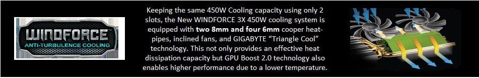 The graphics magic happens underneath the WindForce 3X GPU cooler which utilizes the 3x80mm fans along with six heat pipes running the length of the video card to cool the Kepler GPU in each one of its glorious forms right up to 450 Watts of TDP. There are two benefits gained by using such a formidable heat sink. One, it means the GPU stays cooler which often translates in to faster, more efficient GPU Boost clock performance. And, two, the fans don’t have to spin so fast thus the card produces much less noise than other cards.