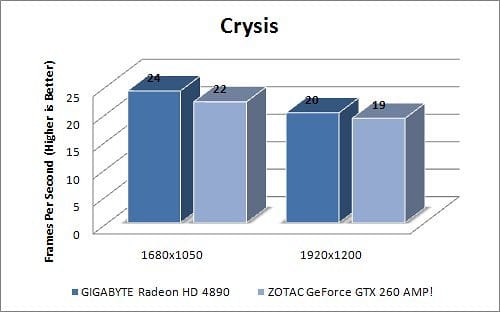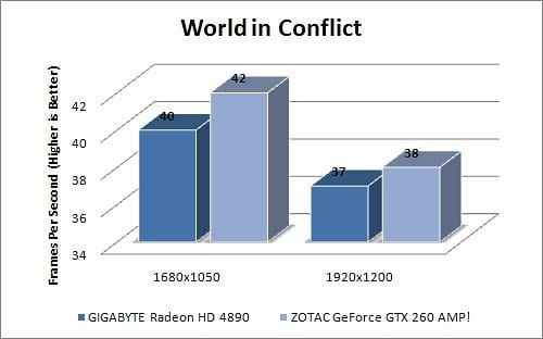 Not as well as I had hoped. I’m really wanting to see some sort of discernable difference between the GTX 260 I picked for a base unit, and the GIGABYTE HD 4890 we’re reviewing. I guess I picked my test subjects well, as the HD 4890 only just came in behind the overclocked GTX260 in the World in Conflict benchmark.