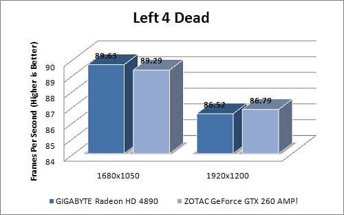 Left 4 Dead is the other title chosen for our DX9 benchmarks. This game was just recently released (recently being late last year), but it still manages to get by using the almost 5 year old Source engine. Like id Software in it’s heyday, this just goes to show the longevity of engines produced by Valve. Unfortunately the engine is old enough to not pose a challenge to the GIGABYTE HD 4890 card and it’s competitor. The numbers posted by either card were near perfectly matched.