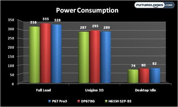 The H61M uses a little less power when loaded up. Otherwise, it’s pretty lean when it comes down to it. If you use some of the low power settings, you can shave off a few more watts when it’s not loaded down. I also want to mention the board is very quiet. There’s no special EMF noise coming off this board even though it’s quite affordable. So overall, good quality, and if you’re in an office building with 100 machines, this board can save quite a bit on the power bill.