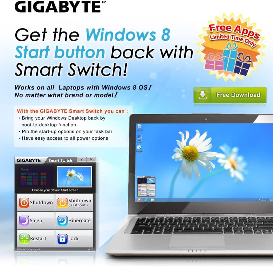 Did you buy a Windows 8 machine? Or did you upgrade an existing machine or install it new on your latest DIY build? I’m sure a lot of you were thought about two things when you first booted up: How do I boot into the desktop, skipping this “Metro” apps stuff and where the heck did my Start Button go? Well, GIGABYTE has given users a gift this week with the unveiling of their new Smart Switch app, which works on any system, desktop or mobile, and lets Windows 8 boot to desktop and more.