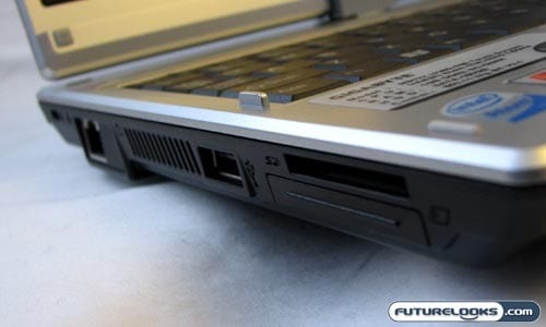 Taking a quick spin around the GIGABYTE netbook, you’ll find no ports at the back. On the left side, you get the Kensington lock port, Ethernet port, exhaust vent, USB port, SD card slot, and ExpressCard slot. The front edge is home to the stereo speakers. Along the right side are the power switch, two USB ports, headphone and microphone jack, VGA port, and power jack.