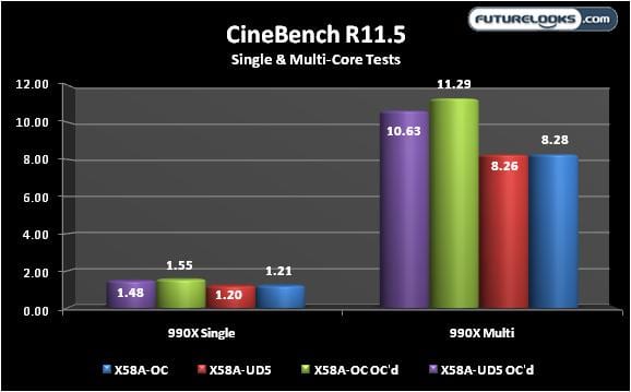 Since this is an all CPU intensive benchmark, the overclock result is pretty clear. If you’re willing to feed your CPU more than 1.5 volts, you’ll reach near 12 on the multicore test. On LN2, you’ll make our score look silly, but may also be looking for a new board after if you do the single use “hero run”.